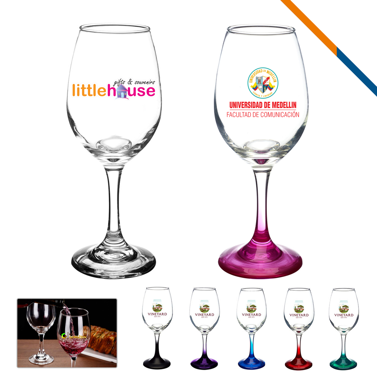 Custom these wine glasses make great gifts! 10 oz. Lorena White Wine Glass is made of highest standard glass material, features a thick stem and base to help prevent messy spills. Feel fine with wine with our customized wine glasses perfect for promotional giveaways for family party events. Standard price for clear glass only, any other color bottom glass will be additional cost. 3 days rush for clear glasses available upon request. Imprint drinkware only can be hand wash. BPA FREE, FDA certified